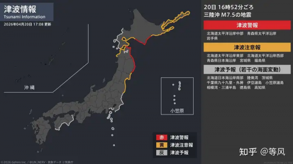 JMA随即发布了海啸警报。实际上本次地震造成的海啸应该不会对三陆冲地区造成明显的灾害性影响(因为当地频繁遭遇海啸,面对7.5级的防御机制已经足够),目前观测到的最大海啸出现在岩手久慈市(0.8m)。