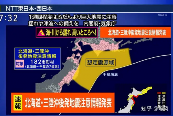 JMA"后续地震注意信息"也提醒了:北海道-三陆冲未来一周内需要注意可能的大地震(气象厅例行公事,因为有一些M7+可能是M8+的前震)。