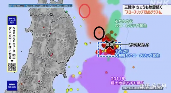 随后,12月,青森外海发生M7.6(上图红圈),触发海啸警报。但是青森外海强震发生在岩手冲西北上百公里远,这中间恰好存在一个空区没有破裂。