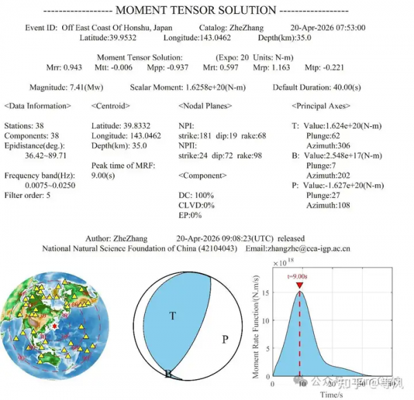 矩心矩张量解完整信息,左图中三角形表示台站,六角星表示震中;中图沙滩球包括矩张量解、主轴与最佳双力偶解;右图表示震源时间函数。 图源:见水印