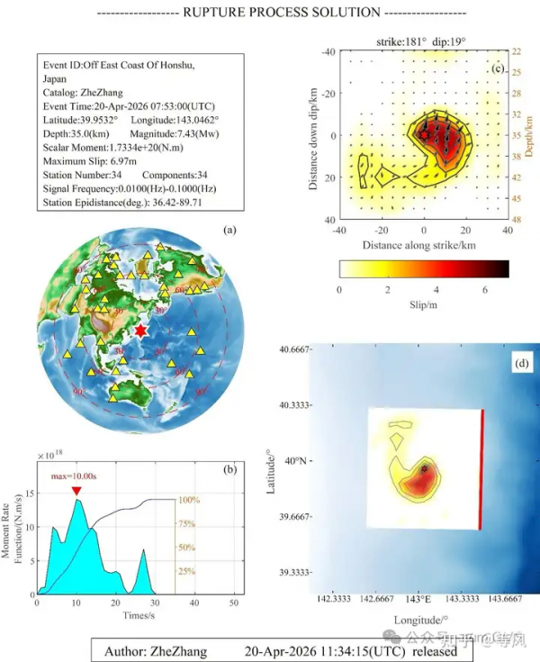 根据张喆(地球物理研究所)的震源反演,这次地震看起来似乎是单侧向南破裂;矩心和最大滑移区域深度接近;在破裂结尾的时候似乎有个独立的子事件;双力偶成分接近100%(说明这是天然地震的有力证据)此次地震断层破裂时间约30s,矩震级Mw7.43,最大累计滑移量为6.97m,释放能量峰值时刻为破裂开始后10s。