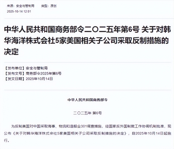 中方将韩华海洋株式会社在美的多家子公司拉入反制名单,原因不是经贸冲突,而是它们"协助"美方对华调查。