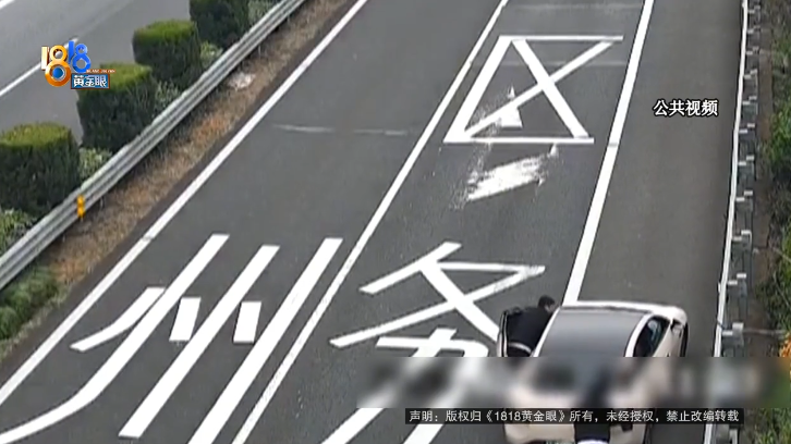 监控显示,一人拉门控向,一人俯身推车,在疾驰车流旁缓慢前行,险象环生。