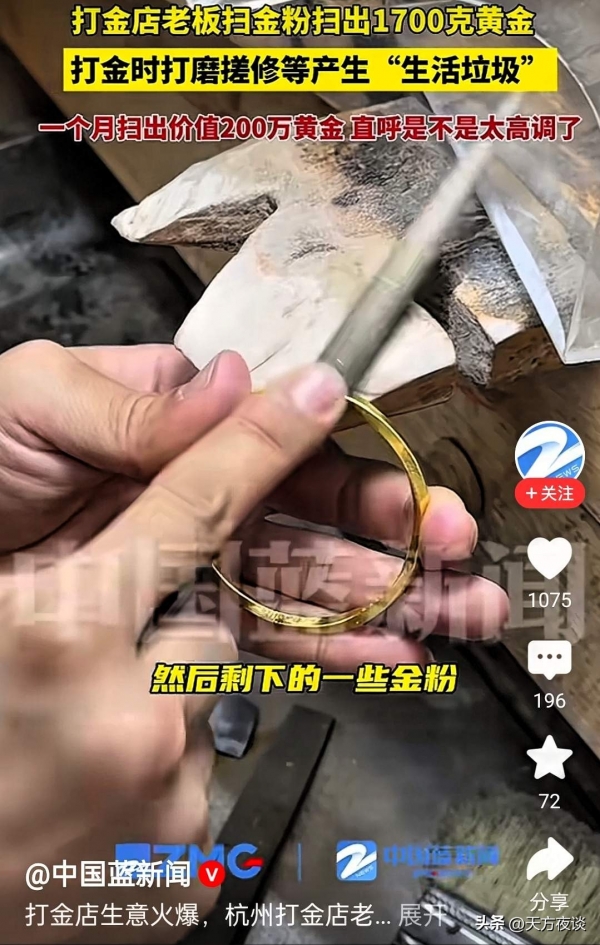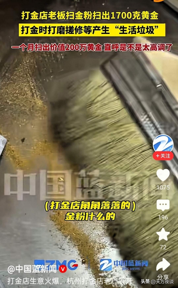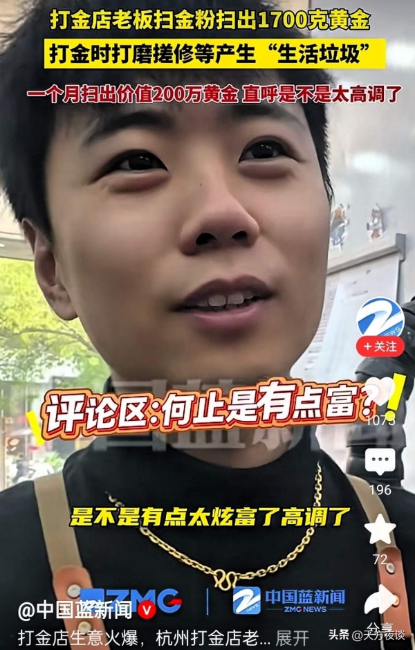 浙江杭州一家打金店,老板把店里的"垃圾"扫了扫,居然扫出1700克黄金,按现在的金价算,差不多值200万。这事一出来,网上直接炸了,老板还凡尔赛了一句:"这就是平时打磨剩下的生活垃圾,是不是有点太高调了?"