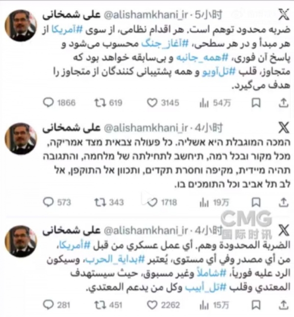 据CCTV国际时讯官方微博,当地时间1月28日晚,哈梅内伊的政治顾问阿里·沙姆哈尼在社交媒体用波斯语、阿拉伯语、希伯来语、英文、中文、俄文等多种语言发文说,所谓美国将采取"有限打击"的说法是一种"幻觉"--伊朗将把任何来自美国的军事行动视为战争开始,并立即实施全面且空前的反击,目标是"特拉维夫(以色列中部城市)的心脏"和所有支持侵略的相关方。