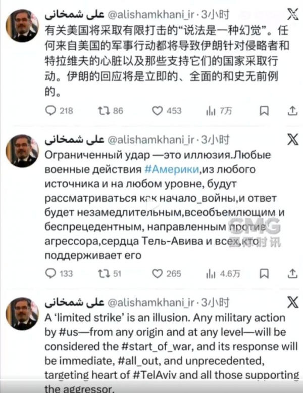 伊朗外长阿拉格齐1月28日在社交平台就美国总统特朗普最新威胁作出回应说,伊朗武装力量已处于高度戒备状态,"手指已经扣在扳机上",将对任何针对伊朗领土、领空和领海的侵略作出迅速而果断的回应。