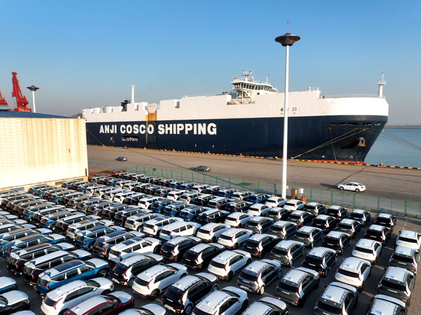 2023年12月2日,在江苏连云港港东方港务分公司码头,滚装轮停靠在59泊位装载汽车出口墨西哥。 视觉中国