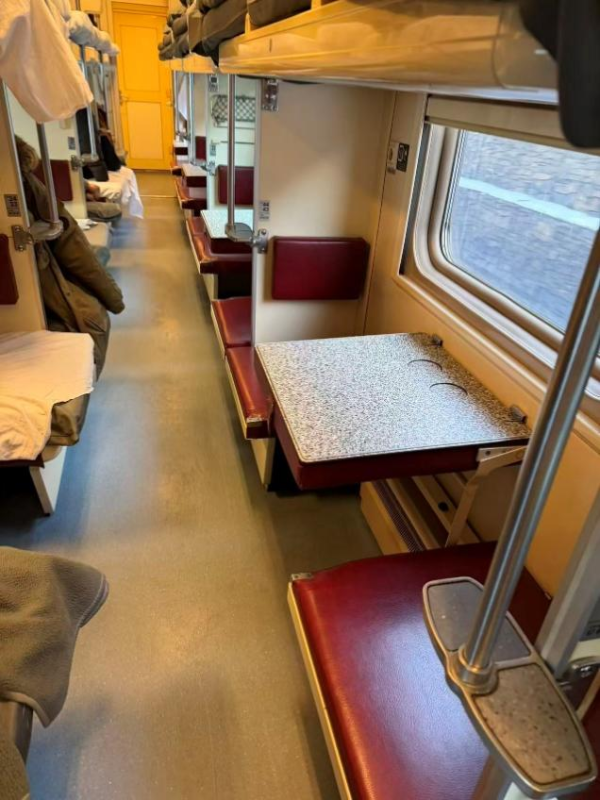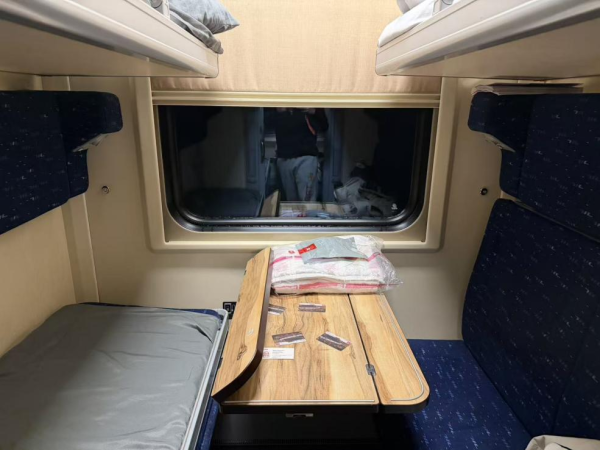 俄罗斯火车的硬座很有意思,可以将桌面放下来与两张对向的椅子一起拼成一张硬板床