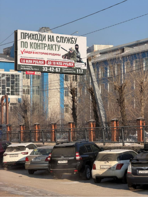 刚踏出酒店,一块大大的招兵广告吸引了我,当时也没有太在意,毕竟俄罗斯处于战争之中,有招兵广告再正常不过了。但实际上乌兰乌德是俄罗斯布里亚特共和国首府,是出了名的"老少边穷"地区。在高薪的吸引之下,大量布里亚特人成为合同兵投入到特别军事行动之中,因此这里参军比例很高。而乌兰乌德作为地区首府,成为了一个重要的转运枢纽。