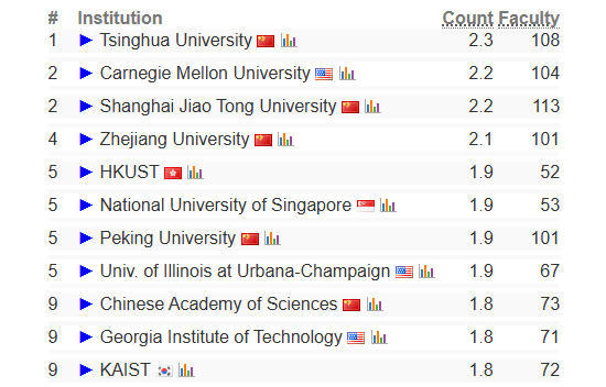 此外,清华大学还领跑SCImago机构计算机科学排名。该排名仅基于全球最大学术数据库(Scopus)中收录的出版物和专利。该榜单中,中国机构占据前十所有位置,斯坦福大学排名第十一。
