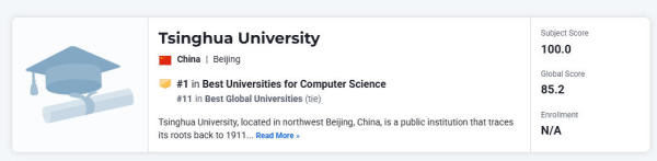 清华大学首次在计算机科学领域拿下《美国新闻与世界报道》榜单的榜首