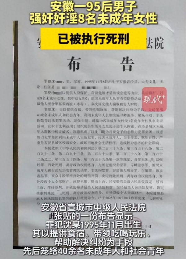 法律的审判,精准而迅速。从宣城市中级人民法院一审以强奸罪等多项罪名判处死刑,到安徽省高级人民法院驳回上诉,再到最高人民法院的最终核准,整个司法程序彰显了对侵害未成年人犯罪"零容忍"的坚定立场。刑法第二百三十六条明确规定,奸淫幼女,从重处罚,最高可判处死刑。沈某案正是这一法条最严厉的实践。他的伏法,不仅是对受害者及其家人的告慰,更是对社会公平正义的有力捍卫,它清晰地传递出一个信号:任何挑战法律和人性底线的行为,都将付出最沉重的代价。