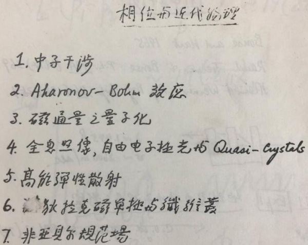1986年5月前后,杨振宁先生在中国科学院研究生院系统讲授一门名为《相位与现代物理》的短期课程,内容共有7个topic(图3):(1)中子干涉;(2) Aharonov-Bohm效应;(3)磁通量之量子化;(4)全息照像,自由电子激光与准晶;(5)高能弹性散射;(6)狄拉克磁单极与纤维丛;(7)非亚(阿)贝尔规范场。杨先生讲的这些内容出乎当时听课者的预料和期望,那时在中国理论物理学界被认为"高大上"的是超弦、场论和粒子物理,而杨先生讲的这些大家大多并不熟悉,却体现了"20 世纪物理学的真精神的东西"。若干年后,我读了杨先生在巴黎国际理论物理会议上的报告"20世纪物理学的三个主旋律:量子化,对称性,相位因子",我才体会到杨先生所指的"真精神"是什么,他多年前讲的东西为什么经常会成为物理学的主流。