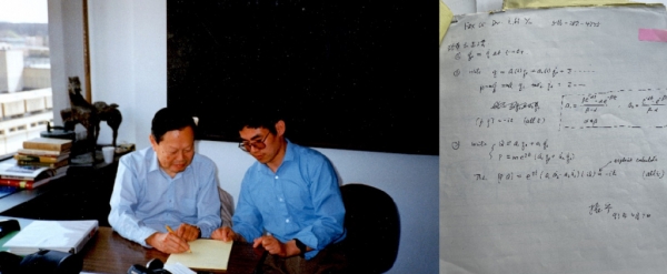 图4 左:孙昌璞与杨振宁在石溪杨先生办公室讨论;右:杨振宁先生写给余理华和孙昌璞的算稿
