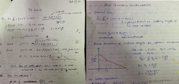 那时候只要杨先生不出差,杨先生几乎每个周末都与我们有长时间讨论, 甚至跟杨先生在一起去推导具体的方程。杨先生亲自动手演算,对此我印象非常之深。有一次,我推导杨先生和Byers合作的那篇关于磁通量子化Byers-Yangtheorem的文章。我觉得文章中的一个公式有符号的问题,结果我们俩一起仔细检查推导了一下午,最后又翻出来杨先生过去的算稿,仔细比较后,才发现还是我错了。杨先生还指导我研究冷原子的玻色爱因斯坦凝聚,我跟随他一起计算了一些非常具体的东西,图5左边是杨先生的算稿,右边是我的算稿,我只是把杨先生研究的谐振子势推广到更一般的约束势。1993年杨先生访问东北师大,在学术座谈会上他还专门强调了冷原子和玻色爱因斯坦凝聚研究的重要性,说它们是未来十年物理学的重要新领域。