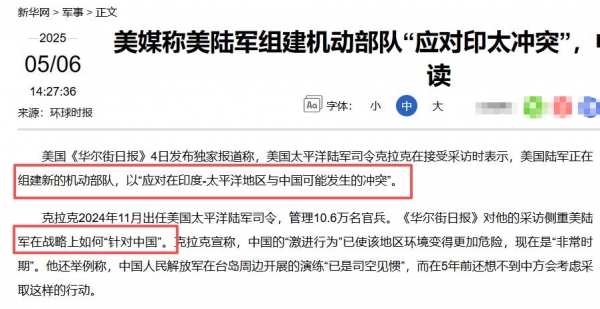 而在5月份,美国太平洋陆军司令透露,美陆军正在组建新的机动部队,专门用来应对印度 - 太平洋地区可能和中国发生的冲突。