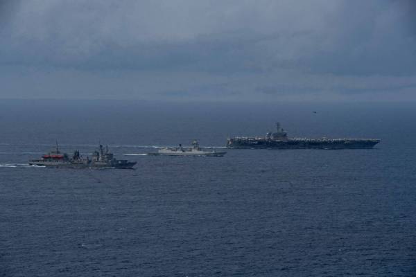 7月12日,"罗斯福"号航母与印度海军"维沙卡帕特南"号驱逐舰、"阿迪亚"号补给舰(从右至左)进行"联合海上活动"美国海军