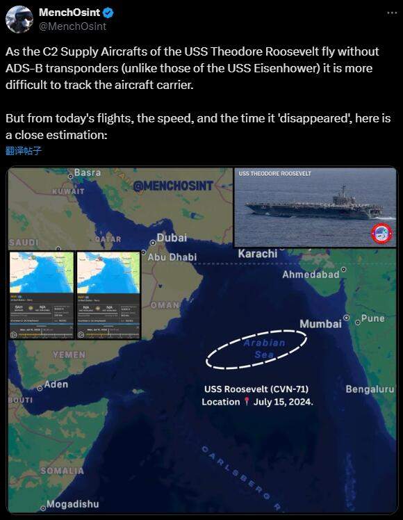 开源情报账户通过C-2"灰狗"应答机推测的"罗斯福"号位置社交媒体