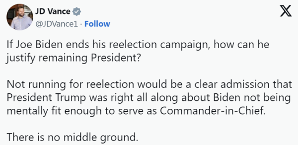 此外,共和党副总统候选人万斯也在社交平台发文称,"如果乔·拜登结束竞选连任,他将如何证明自己继续担任总统是正确的?"
