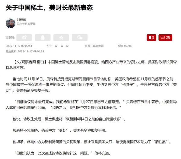 日前,美财长贝森特隔空喊话中国,希望中美在11月27日感恩节之前签署稀土协议,他相信中方会履行承诺,倘若中方中途变卦的话,美国将有诸多报复手段。