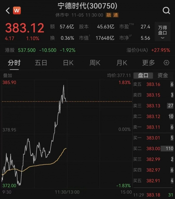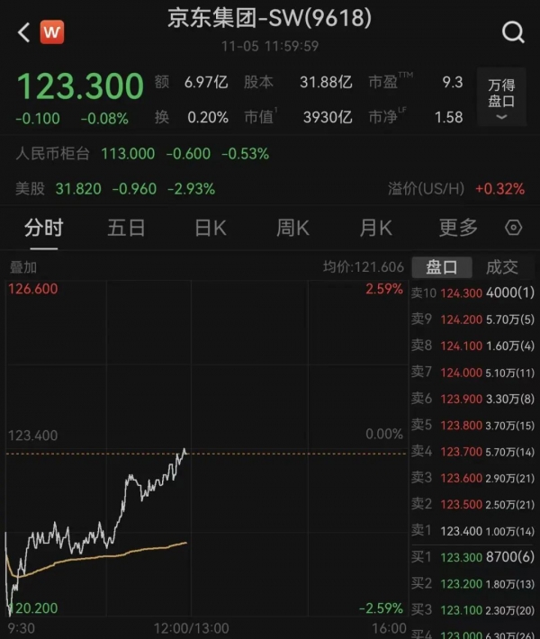截至11月5日午间收盘,京东集团(9618.HK)股价跌0.08%,A股宁德时代(300750.SZ)股价涨1.1%,H股宁德时代(3750.HK)股价跌1.92%。