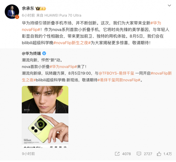 余承东也在微博发布消息为华为nova Flip预热。他表示,华为持续引领折叠手机市场,并不断创新。作为nova系列首款小折叠手机,它将时尚先锋的美学基因,与年轻人彰显自我的个性相融合,带来更加前卫、独特的用机体验。