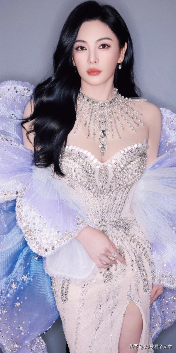 礼服主体以月光白为底色,千万颗碎钻与珍珠如星子坠入银河,从胸衣蔓延至裙摆,每一寸都在光影里折射梦幻光晕;一侧开叉设计大胆又优雅,将腿部线条衬得愈发修长;最绝的是那对渐变蓝紫的 "蝶翼" 披肩,薄如蝉翼的纱上缀满星光装饰,既像蝴蝶振翅欲飞,又似星云在肩头流转。珍珠颈链与厚底高跟把华丽感拉满,却丝毫没压过她的气场 -- 仿佛 "华丽是铠甲,柔美是底色,强大是内核"。