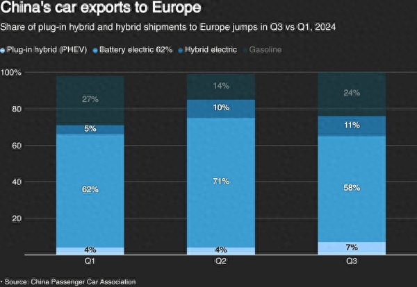 根据中国乘用车市场信息联席会(CPCA)的数据,7月到10月期间,混动车出口至欧洲的数量较去年同期大幅增加,达65800辆,扭转了今年初以及2023年电动车销售量下滑的趋势。