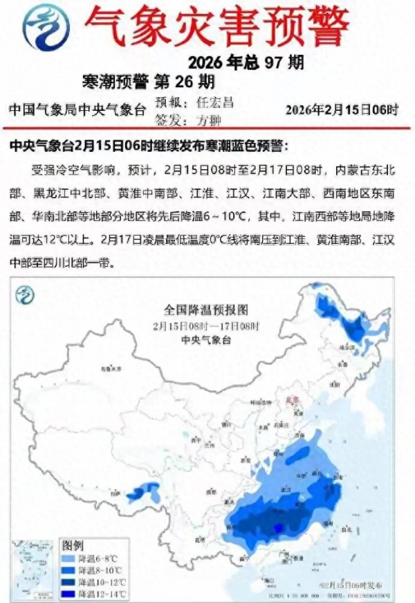 受强冷空气主力南下影响,15日08时至17日08时,寒潮将横扫我国中东部大片区域。内蒙古东北部、黑龙江中北部、黄淮、江淮、江汉、江南大部、西南地区东南部、华南北部将先后出现6-10℃大幅降温,江南西部局地降温更是超过12℃。17日凌晨,0℃线将一路南压至江淮、黄淮南部、江汉中部至四川北部一带,湿冷透骨与干冷刺骨双重来袭,体感温度直线跳水,户外停留极易受寒冻伤,老人小孩与体弱者务必减少外出。