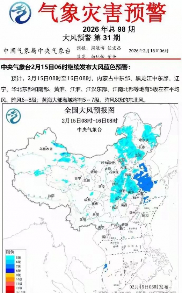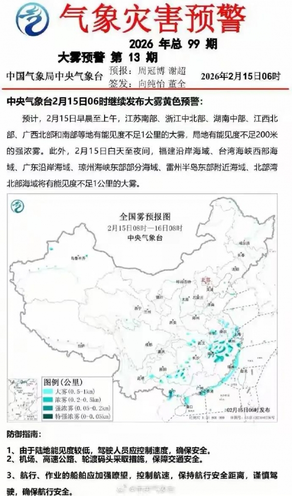 2026年2月15日清晨6时,中央气象台连发三道预警:寒潮蓝色预警、大风蓝色预警、大雾黄色预警同步生效,覆盖中东部大部地区。此刻正值春运节前最高峰,全国高速车流饱和、机场航班密集、水陆客流叠加,恶劣天气三重夹击,返乡路风险陡增,所有归乡人务必立刻警惕!