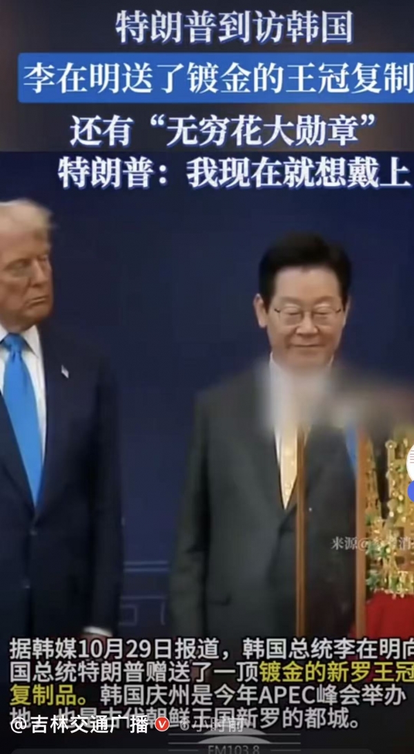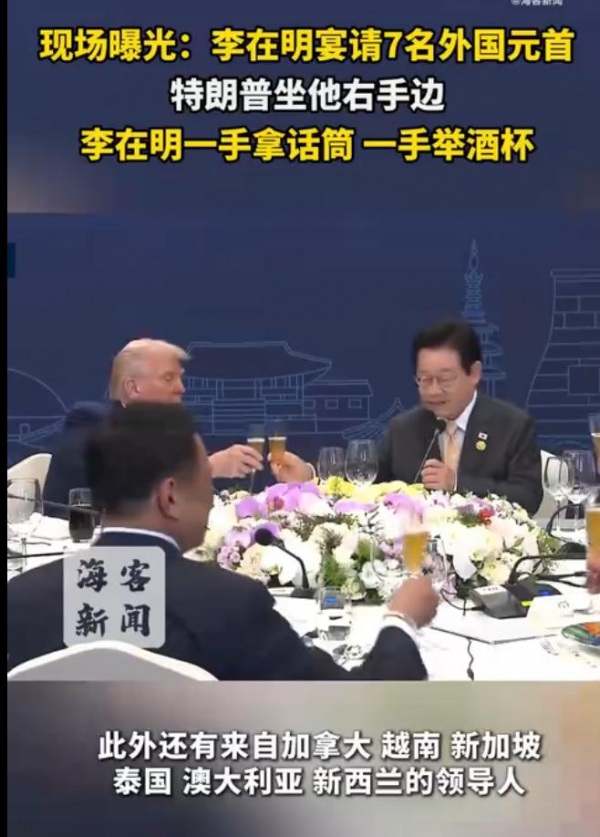 特朗普坐于李在明右侧,这个被媒体解读为"权力坐标"的位置,实则是东方待客之道的具象化--右为尊,既合国际惯例,又暗喻韩国在亚太棋局中的"桥梁"角色。席间,侍者以银杏木托盘呈上的参鸡汤,汤面浮着庆州特有的山野菌,每一口都是对"地缘相近"的隐喻;而青瓷酒杯中晃动的韩国传统米酒,在碰杯时发出的清脆声响,恰似历史与未来的和鸣。