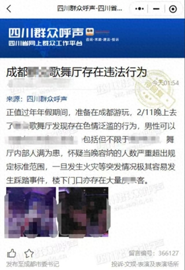 举报内容来自外地来蓉游客。游客2月11日晚进入涉事歌舞厅,现场目睹明显违规行为,随即通过官方渠道提交举报信息。这条举报不是孤立事件。同一歌舞厅在2025年10月与2026年2月均收到网友实名举报,举报内容指向涉黄与有偿陪侍。普通游客走进娱乐场所,本是体验城市夜生活,却遇到这类糟心事,出行体验大打折扣。网络问政平台本是群众反映问题的便捷通道,连续举报却没能让问题得到彻底解决,难免让人心里不舒服。媒体求证环节遭遇电话无人接听,公众的疑惑更难得到及时解答。