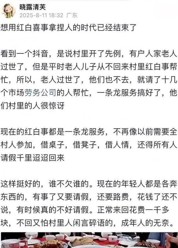 人情社会的根深蒂固,也滋养了利益网络。大量操办丧事的周边行业,从饭店到殡葬公司,都围绕着葬礼经济分蛋糕。村民们对"白事简办"反感,一定程度上也因为利益受损。这不是道德高地的问题,而是现实利益的碰撞。习俗之所以难以改变,本质是一种共同体内的利益再分配机制,对任何想要破局的人来说,不啻于挑战整个惯性体系。