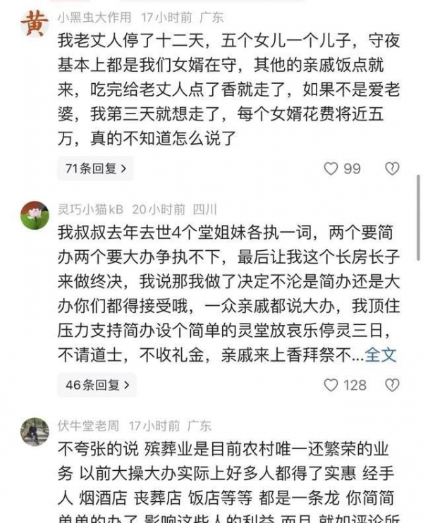 有些人愿意逆流而上。比如另一位网友坚持简办叔叔的丧事,面对几位亲属坚持"大面子",他顶着压力取消道士祭祀、拒绝收礼,不设宴席,把繁琐缩短到三天。这番举动虽招来不少埋怨,却让参与者松了口气。与其说是在简化仪式,不如说是努力挣脱社交绑缚,让送别真正回归本意--悼念逝者。