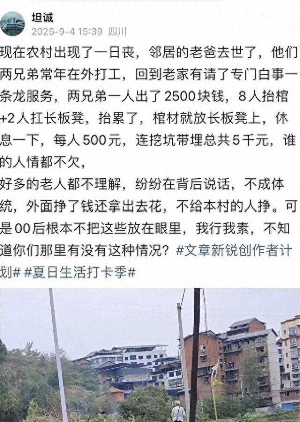 在当下社会,关于死亡和送别的仪式,早已悄然发生改变。最近四川一则事情引发不少共鸣:一位村里老人去世,两位儿子选了"白事一条龙"服务,丧葬流程简单直接,费用明朗且分摊省心。五千元买来全部流程,两兄弟一人一半,所有劳力、事务都交由专业团队打理。八人齐心抬棺,几乎像流水线,快速完成所有步骤。不欠人情,更不必四处求人,这与过往村落中冗长而人情缠绕的丧事形成了强烈对比。