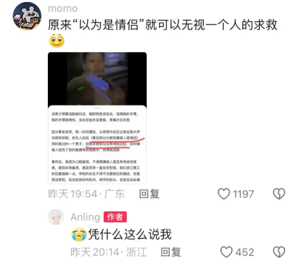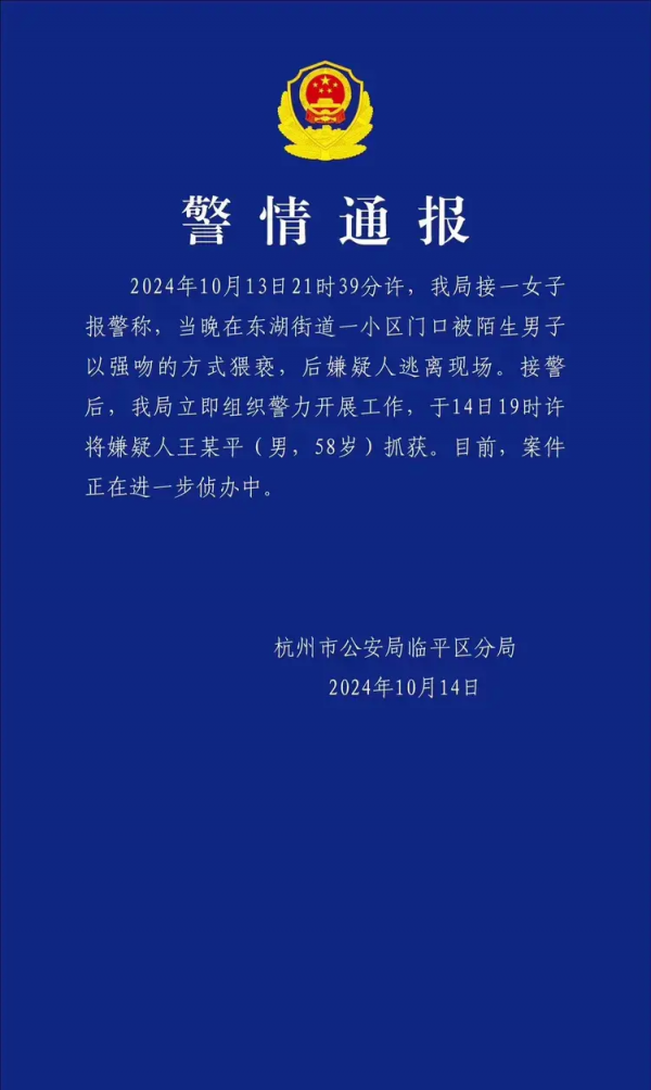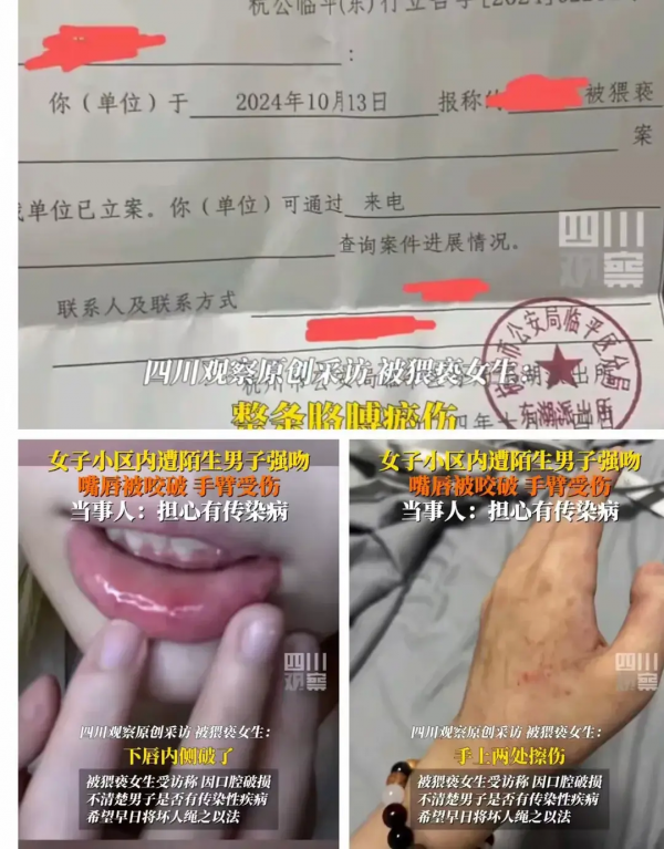 13 号晚上的杭州9 点半,女子(下面称呼她为小张)在自家小区门口电动车上回消息,迎面走来一个男子,小张起初没在意,以为是路过的人,没想到下一秒男人竟拉扯她的脖子,强吻了她,还咬破了她的嘴唇,得逞后,男子逃跑,小张反应快,立马抓住了他,男子便开始攻击小张,小张当即被吓懵,男子挣脱后逃跑。