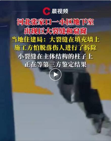 11月4日,网友发视频反映,河北张家口市荣盛城小区地下车库墙面出现大裂缝,担心房屋存在安全隐患。视频显示,该车库墙面、地面、柱子上有多个大裂缝,墙面上还有大洞。