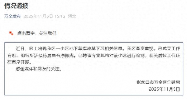 近日,网上出现我区一小区地下车库地基下沉相关信息。我区高度重视,已成立工作专班,组织所涉楼栋居民有序搬离。已聘请专业机构对该小区进行检测,相关后续工作正在有序开展。