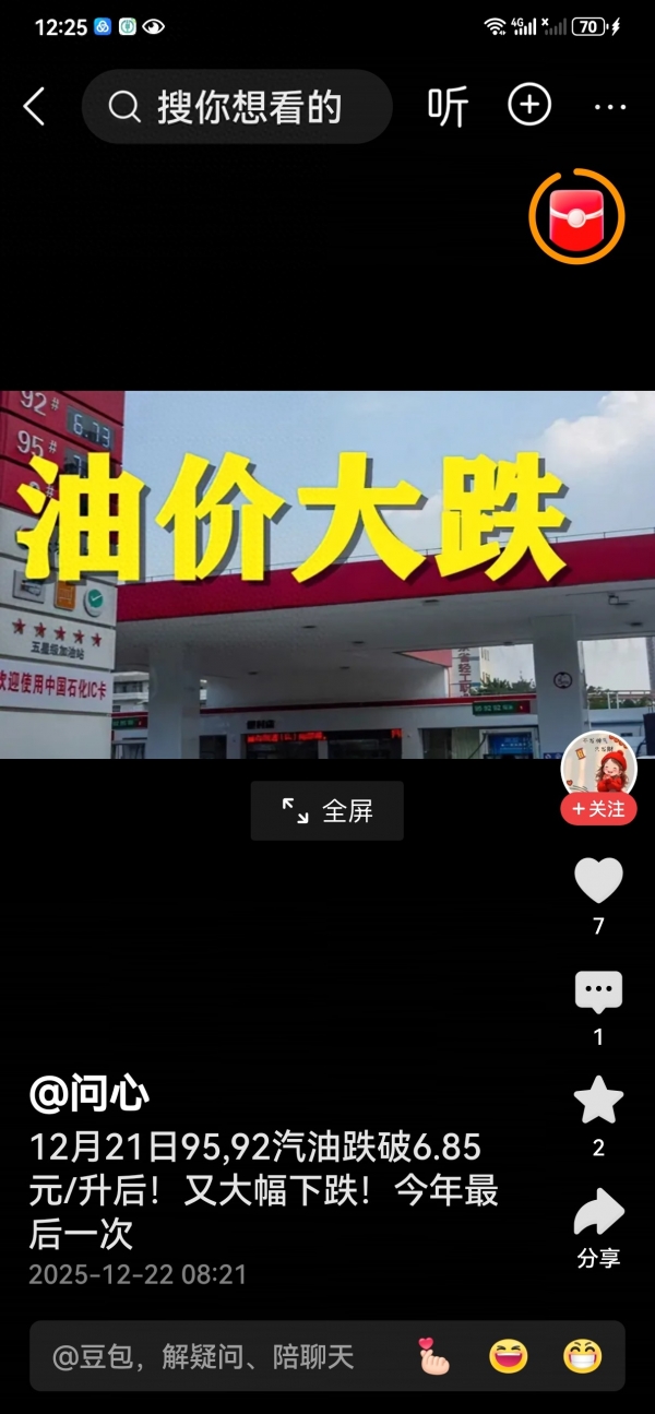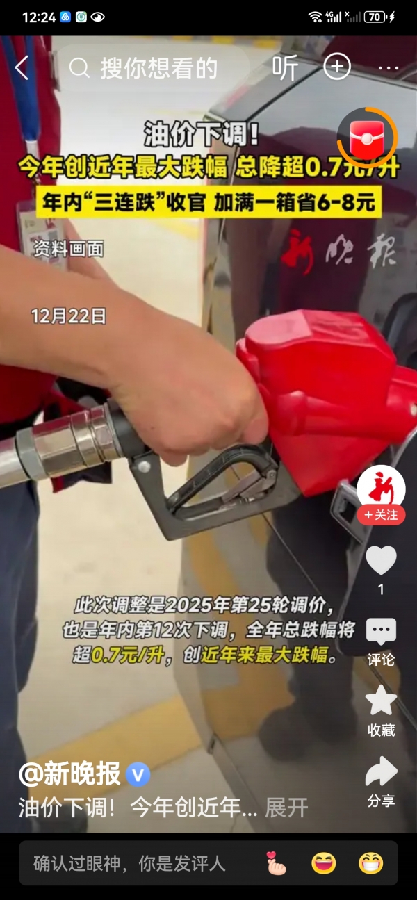 按普通家用汽车50升油箱容量计算,本轮调价后加满一箱92号汽油将节省6.5元左右,加满95号汽油则可节省7元上下 。看似单笔节省金额不大,但叠加12月以来的两轮下调,累计福利十分可观:12月油价总跌幅已突破200元/吨,95号汽油累计下跌达0.2元/升,全年汽柴油价格较去年底分别下跌745元/吨和715元/吨,折算后全年每升油价总跌幅超过0.7元 。