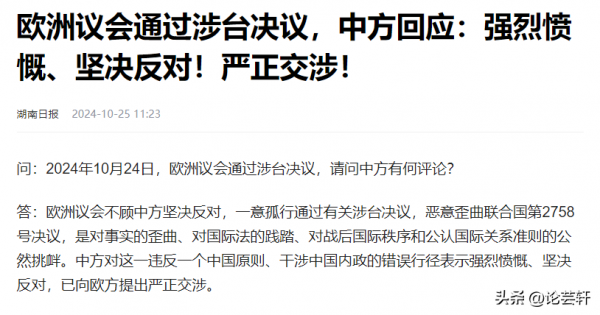 信息来源:湖南日报2024-10-25--《欧洲议会通过涉台决议,中方回应:强烈愤慨、坚决反对!严正交涉!》