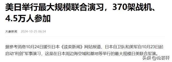 信息来源:大象新闻2024-10-25 --《美日举行最大规模联合演习,370架战机、4.5万人参加》的报道