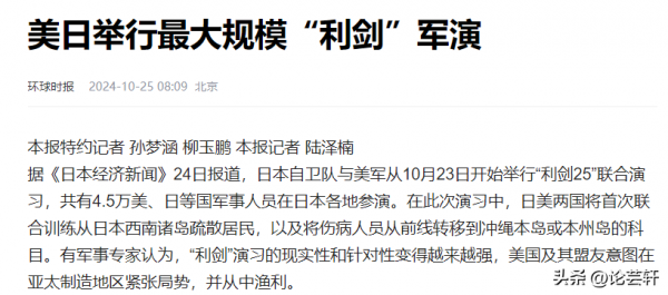 信息来源:环球时报2024-10-25 --《美日举行最大规模"利剑"军演》的报道