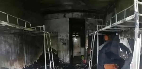 据官方所公布火灾事故调查报告中宿舍平面图,起火房间分住宿、阳台、卫生间三个部分。住宿部分,南、北各一排床铺,两排床铺中间是过道。