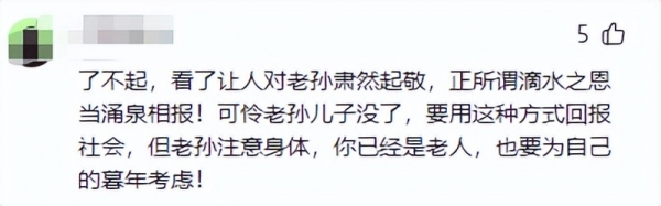 了不起,看了让人对老孙肃然起敬,正所谓滴水之恩当涌泉相报!可怜老孙儿子没了,要用这种方式回报社会,但老孙注意身体,你已经是老人,也要为自己的暮年考虑!