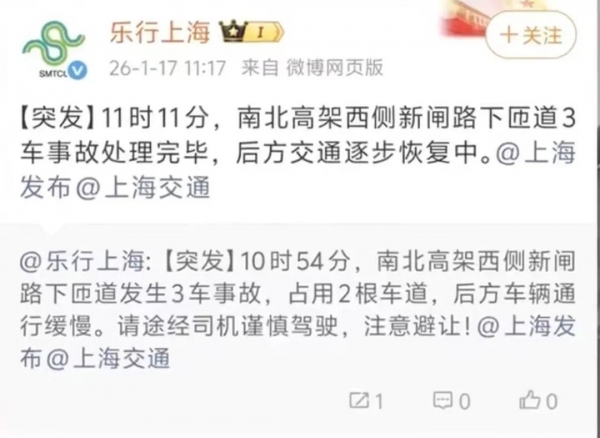 据@乐行上海,中午11时11分,南北高架西侧新闸路下闸道3车事故处理完毕,后方交通逐步恢复中。