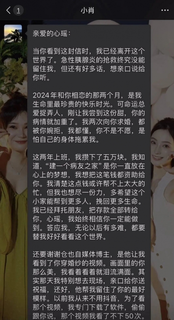 遗书里,肖先生写道:"2024年和你相恋的那两个月,是我生命里最珍贵的快乐时光。可命运总爱捉弄人,刚让我尝到这份甜,你的病情就加重了。我两次向你求婚,都被你婉拒,我都懂,你不是不愿,是怕自己的身体拖累我。这两年上班,我攒下了五万块。我知道,"建一个病友之家"是你一直放在心上的梦想,我想把这笔钱都资助给你。我清楚这点钱或许帮不上太大的忙,但我也想尽一份力,多希望这个小家能帮到更多人,挽回更多生命。我已经拜托朋友,把存款全部转给你,心瑶,我始终相信你一定能做到。答应我,无论以后有多难,都要替我好好看看这个世界。还要谢谢仓也自媒体博主,是他让我看到了你穿婚纱的视频。画面里的你那么美,我看着看着就泪流满面。其实那天我特别想去现场,亲口给你送祝福,还好,他帮我留住了你的最好模样。以前我从来不用抖音,为了看那个视频,我专门下载了软件,偷偷跟你说,那个视频我看了不下50次。"
