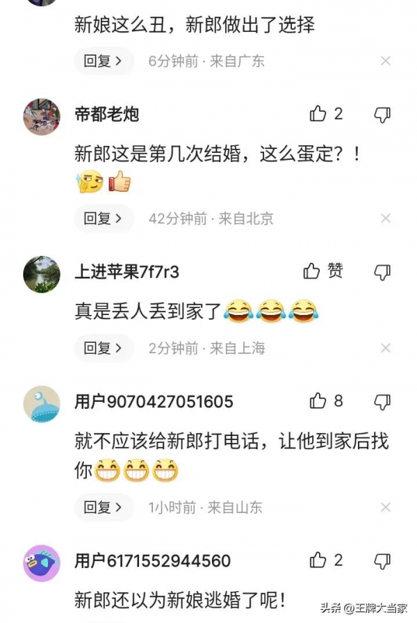 有网友开玩笑:也许是因为新娘的颜值不过关,新郎思前想后,决定偷偷溜走,可惜未能成功。