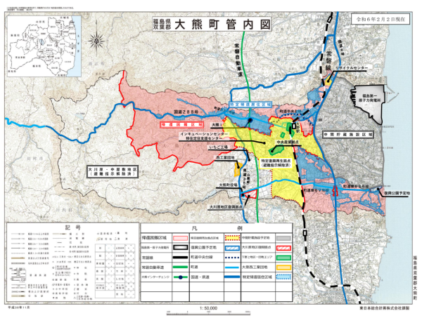 红色范围内即为"归还困难区域"。此外图中靠右侧的灰黑色区域则是福岛核电站和存放被辐射污染的水和土壤的储藏区域。图中仅为大熊町的相关区域地图,北部、南部还有更多区域目前处于封锁当中。