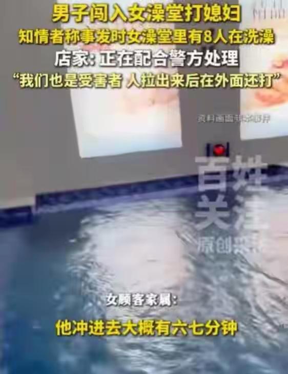 1月28号晚上快11点,在河南周口鹿邑县一家叫"四季和园"的洗浴中心,一名男子直接闯进女浴区,他推倒了守在门口的工作人员,强行挤了进去,当时里面有8名女性正在洗澡,这人直接冲向他妻子,动手打人,整个过程持续了五六分钟,现场一片混乱,衣服丢得到处都是,有人尖叫着往外跑,谁也没能拦住他。