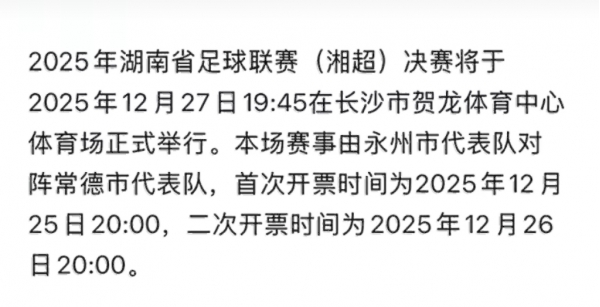 贺龙体育中心的灯光已经亮起,一场决定湖南业余足球最高荣誉的战役,将在2025年12月27日19:45打响,湖南省足球协会超级联赛(湘超)决赛将在长沙市贺龙体育中心体育场隆重上演。经过一个赛季的激烈角逐,永州市代表队与常德市代表队脱颖而出,会师决赛舞台,争夺2025年度湘超联赛冠军奖杯。